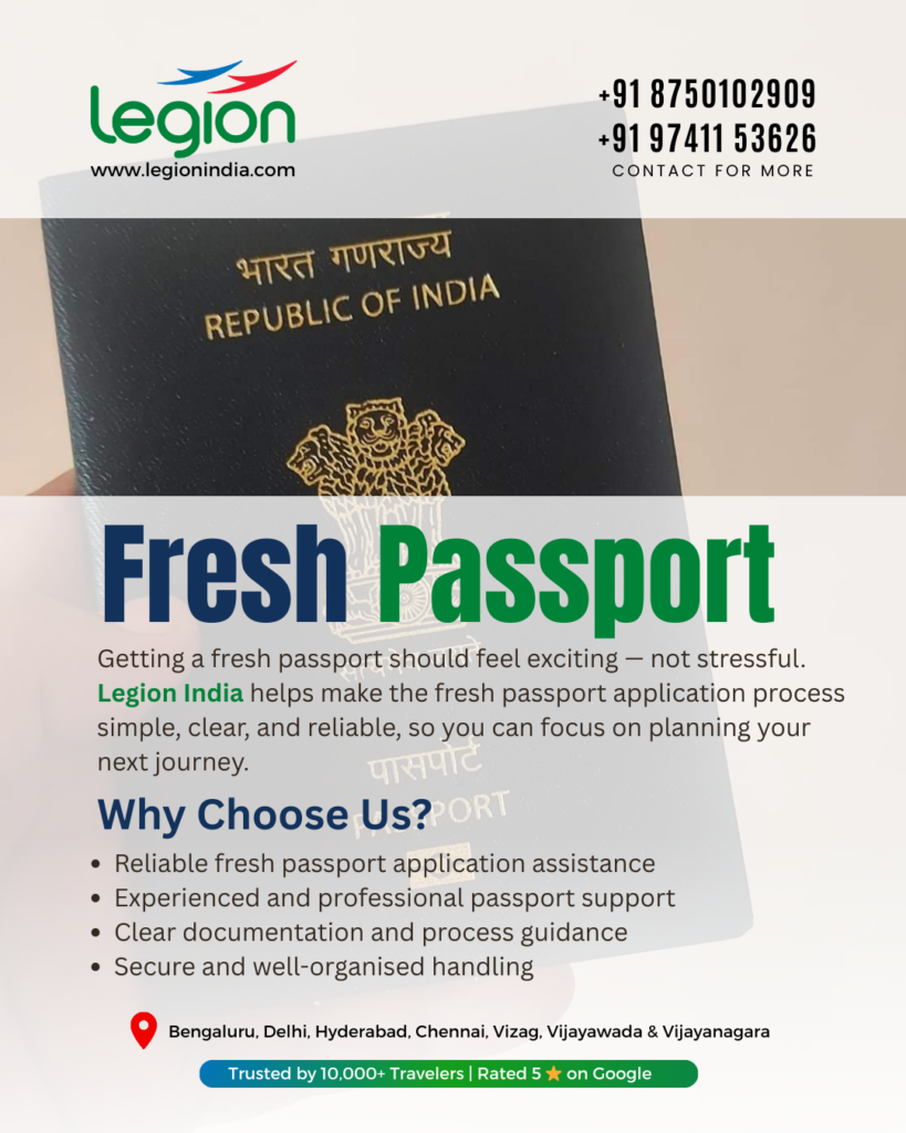 Legion India provides assistance for fresh passport applications in India, helping individuals apply for a passport for the first time with proper documentation and guidance.